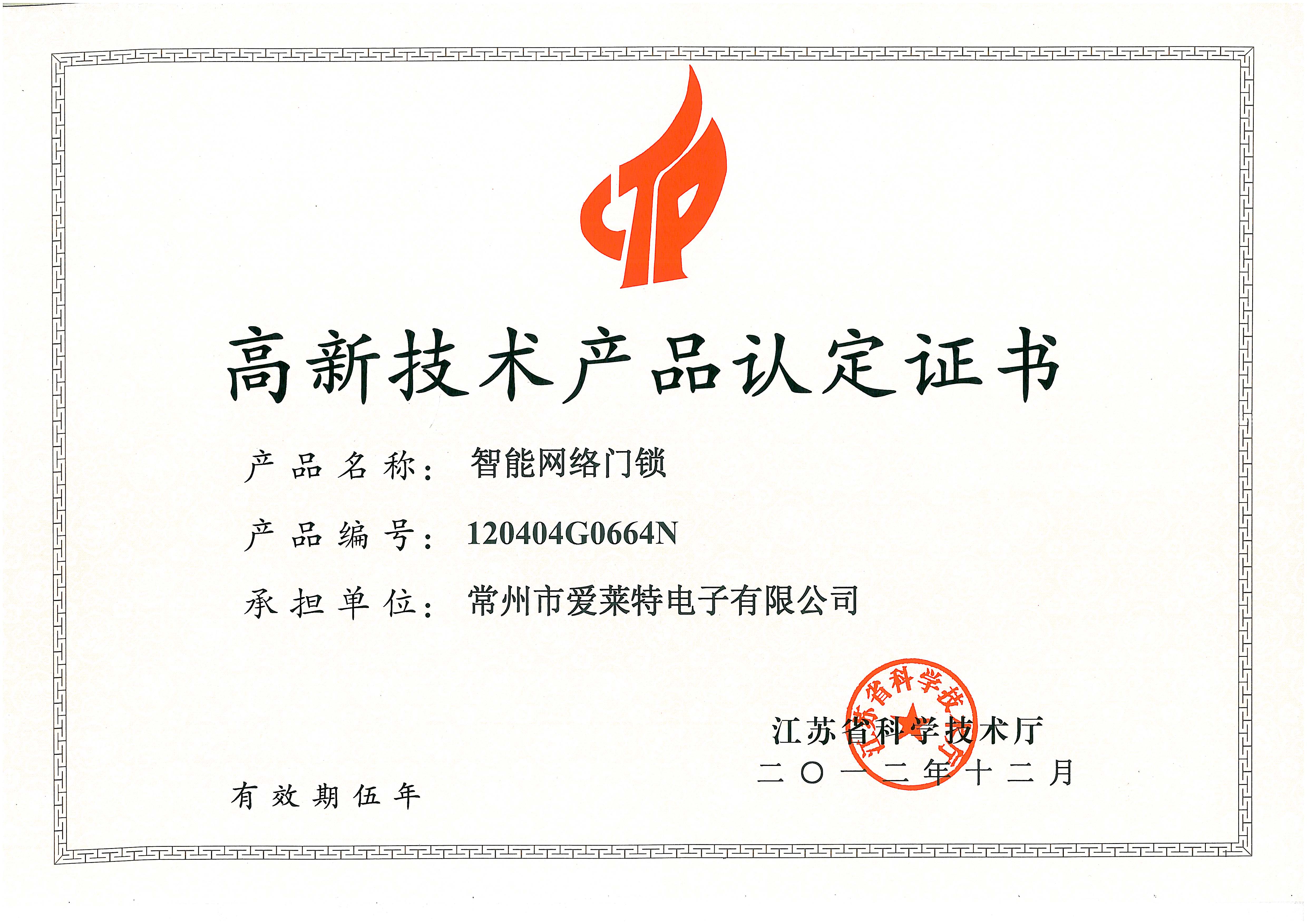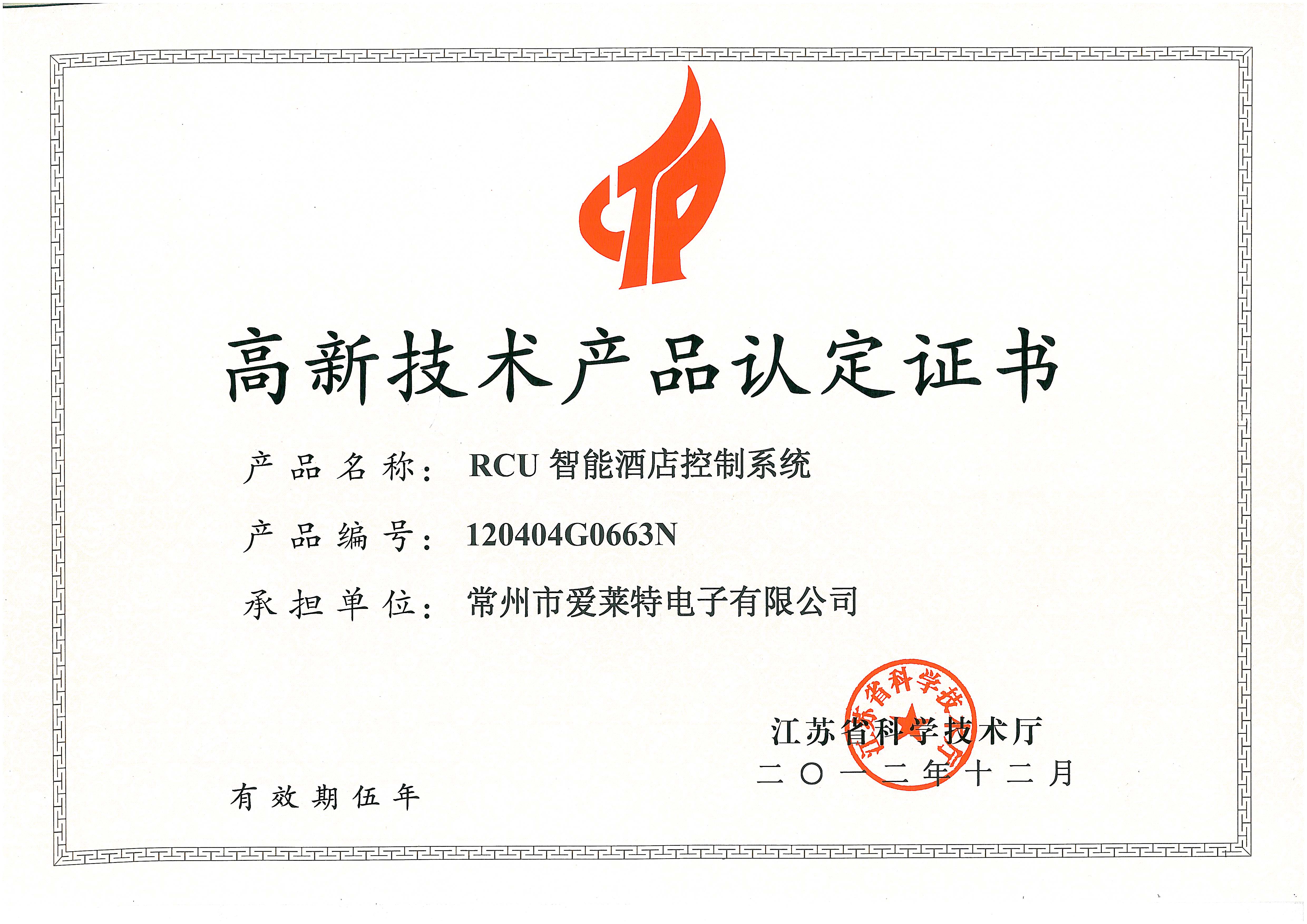 我司RCU智能酒店控制系統(tǒng)和智能聯(lián)網(wǎng)門鎖,分別榮獲江蘇省科學(xué)技術(shù)廳頒布的高新技術(shù)產(chǎn)品認(rèn)證書。