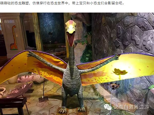 ※從門廳到過道,從餐廳到中心水景,甚至電梯內(nèi),都隨處可見恐龍?jiān)?,堪稱酒店中的迪士尼。還有熱帶雨林餐廳,與恐龍同吃同住。